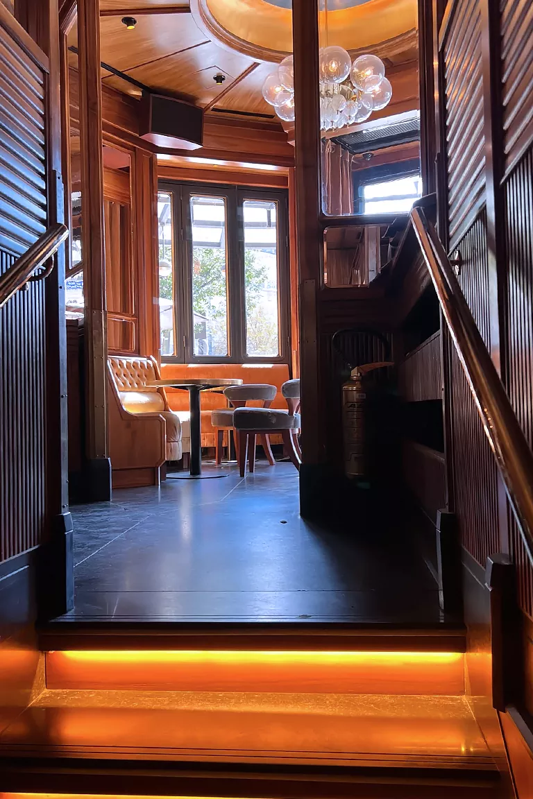 S.A.R. a effectué la rénovation dans cet établissement chaleureux du XVIème arrondissement reprenant les codes traditionnels et intemporels des brasseries de la capitale. Les boiseries en noyer ornent les murs et les plafonds, illuminées par de grands miroirs biseautés et des éclairages subtils en laiton, verre et or. Les fauteuils en cuir bordeaux, les banquets en velours caramel et les tapis à motifs floraux apportent de la couleur à l’ensemble. Dans l'espace WC, aucune coupe n'a été réalisé sur le carrelage, car les murs et les portes ont été pensés en fonction de la taille des carreaux.